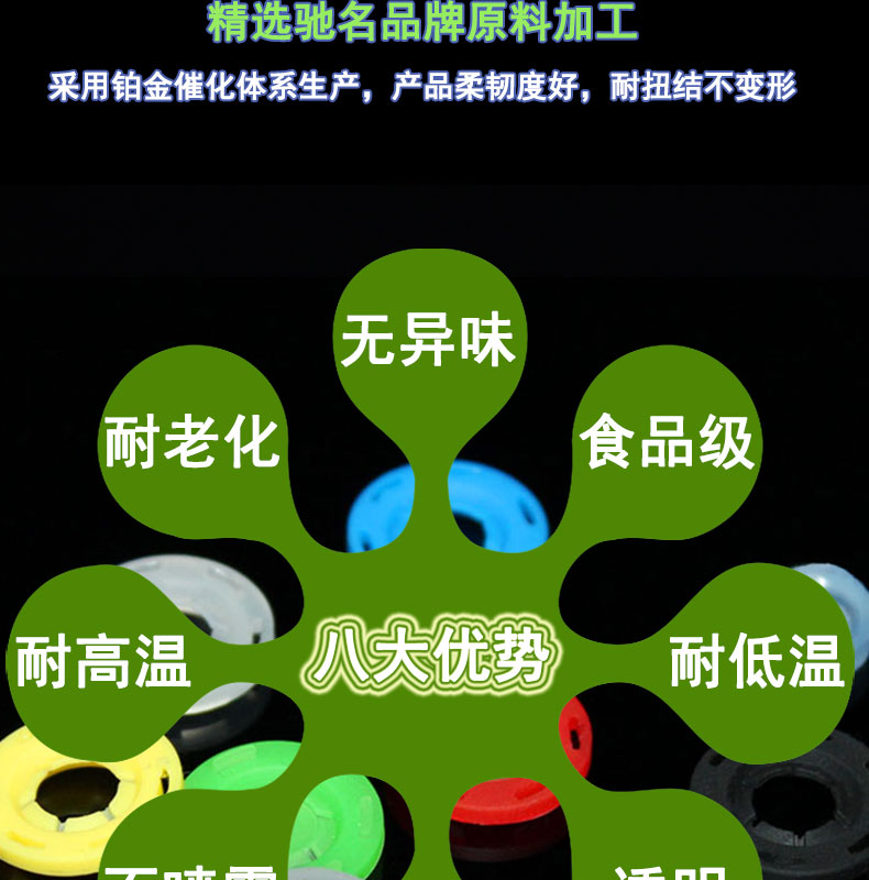 采用進口硅膠材料,模壓成型,內壁平滑,壁厚均勻;常規60度(邵氏硬度值20-80度);耐溫范圍廣(-50~+280℃),可以適應高、低溫設備需求,并耐老化。常規PE袋+紙箱包裝,特殊要求可按客戶標準;產品符合SGS、FDA、LFGB、生物相溶性等;用于灌裝機、蠕動泵專用、醫療醫用器械、輸液泵等。